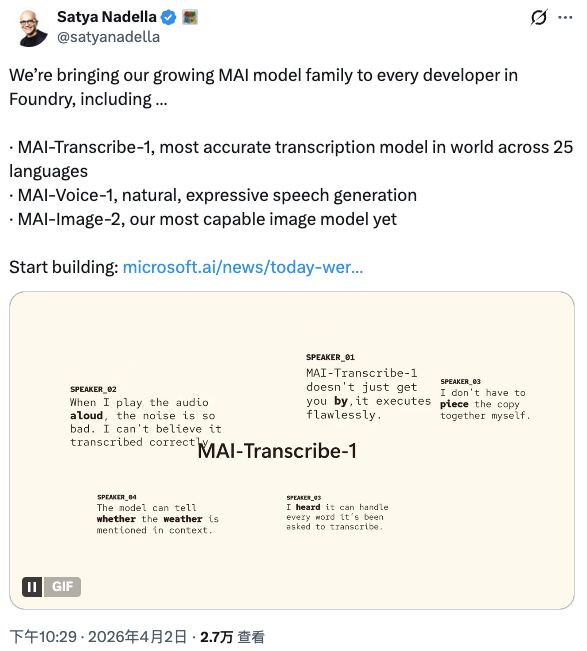 具体来说,微软AI超级智能团队开发的MAI-Transcribe-1、MAI-Voice-1和MAI-Image-2三款模型,涵盖了企业AI中最具商业价值的3项能力——语音转录、语音生成和图像创建。
